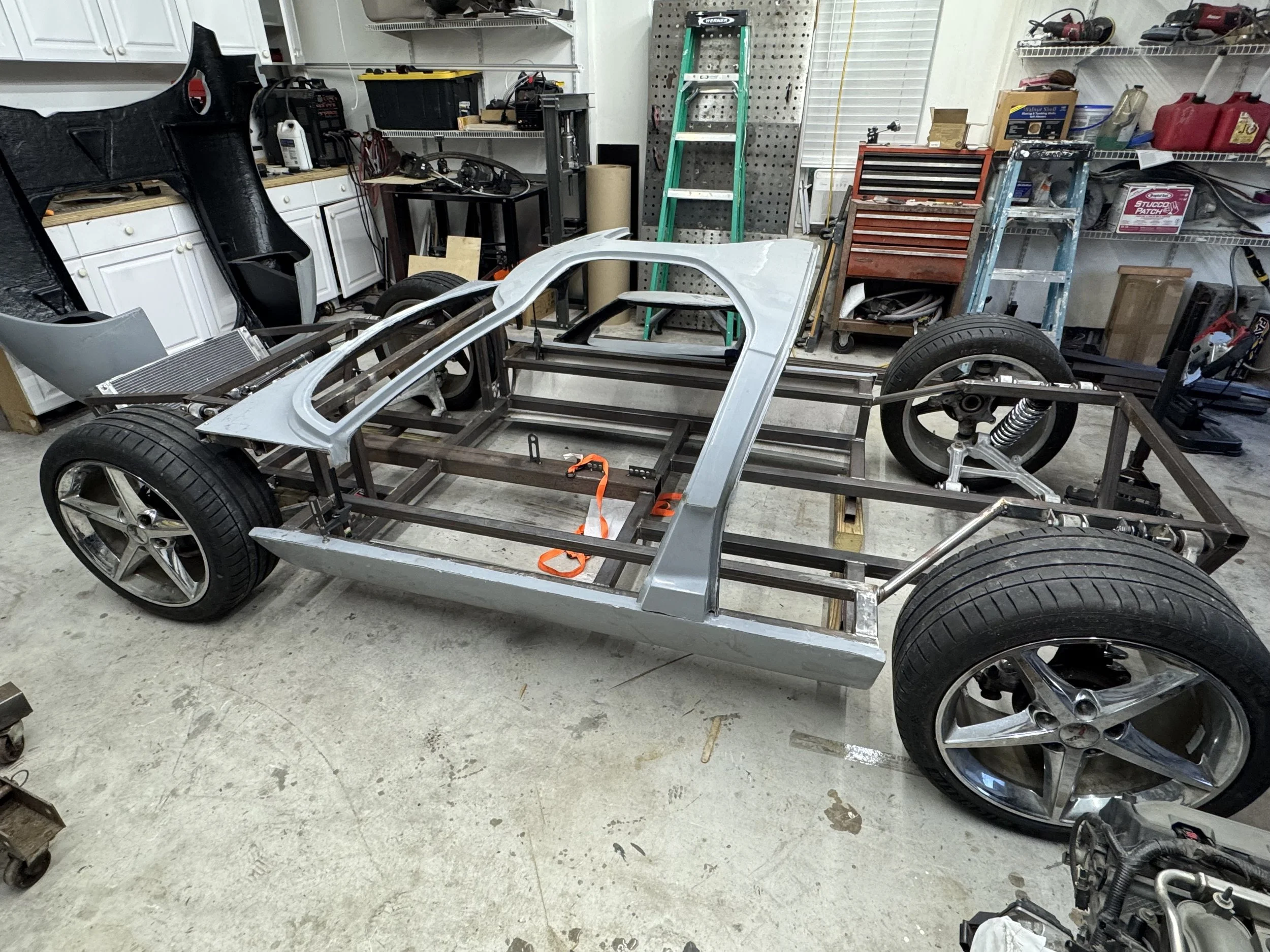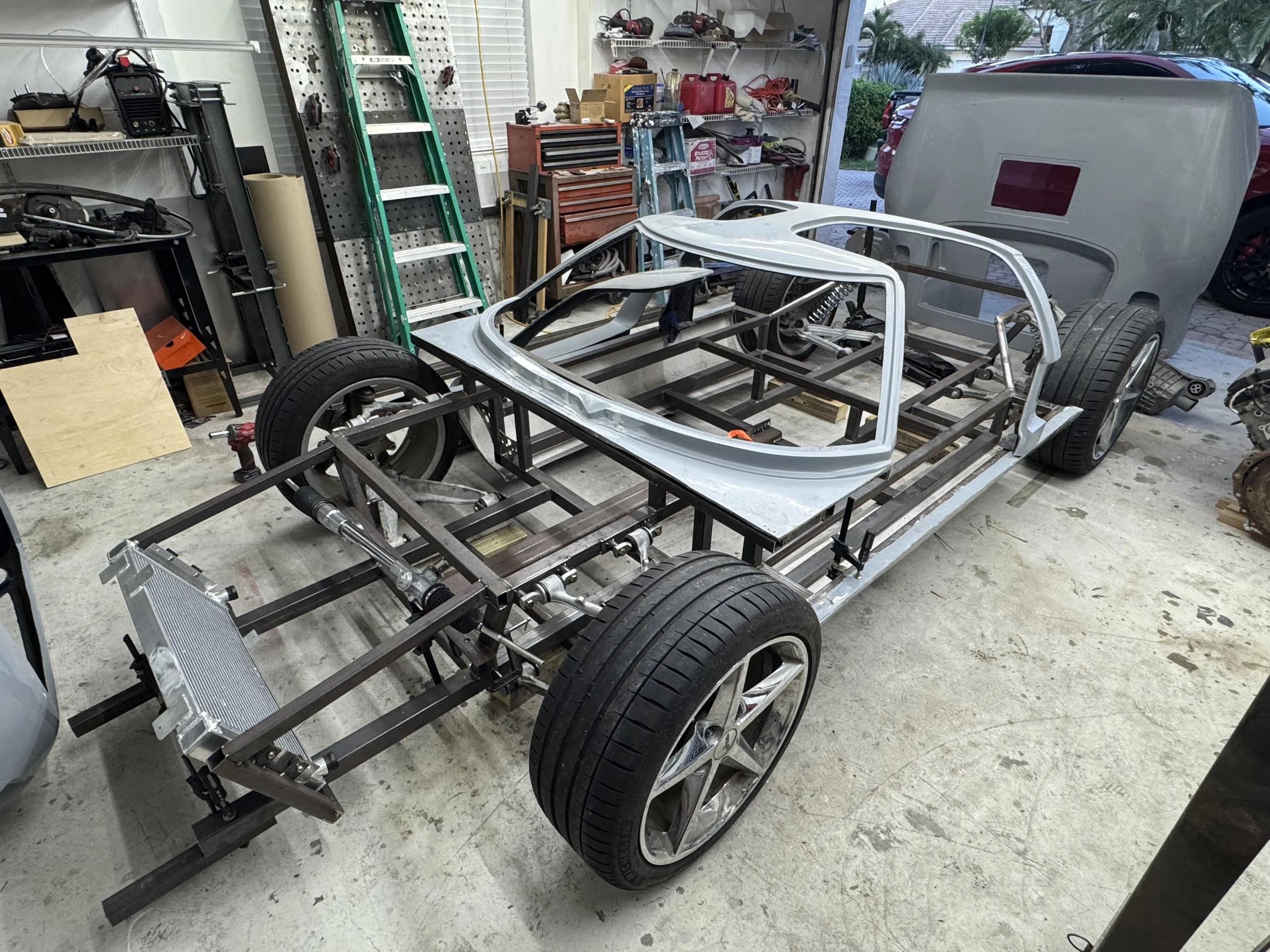 After months of measuring, mocking up, and refining pickup points, seeing the chassis on the ground is a huge milestone. The suspension geometry is based around C5 Corvette components, and the wheelbase has been matched precisely to the C5 layout, ensuring correct proportions, proper stance, and predictable handling characteristics from the start.